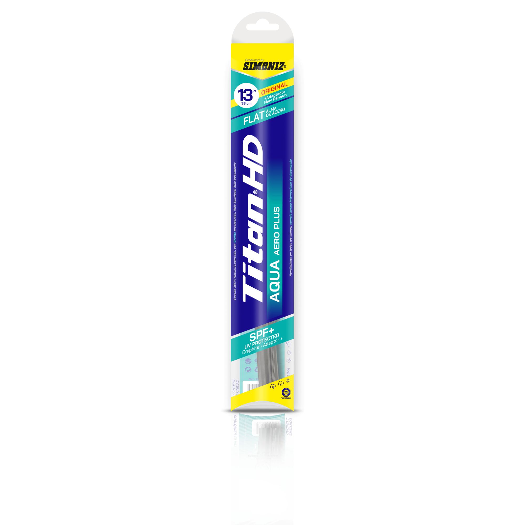 TITAN® HD AQUA AEROPLUS Es una plumilla limpiaparabrisas tipo flat de primer precio con ALMA METÁLICA INDEFORMABLE en su interior.